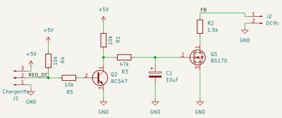 Dazu dient die folgende Schaltung die von links das LED-Signal (RED_OC) auf nimmt und rechts einen 1,5k Ohm parallel zum 270 Ohm (FB) des DC Reglers schaltet.